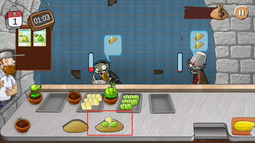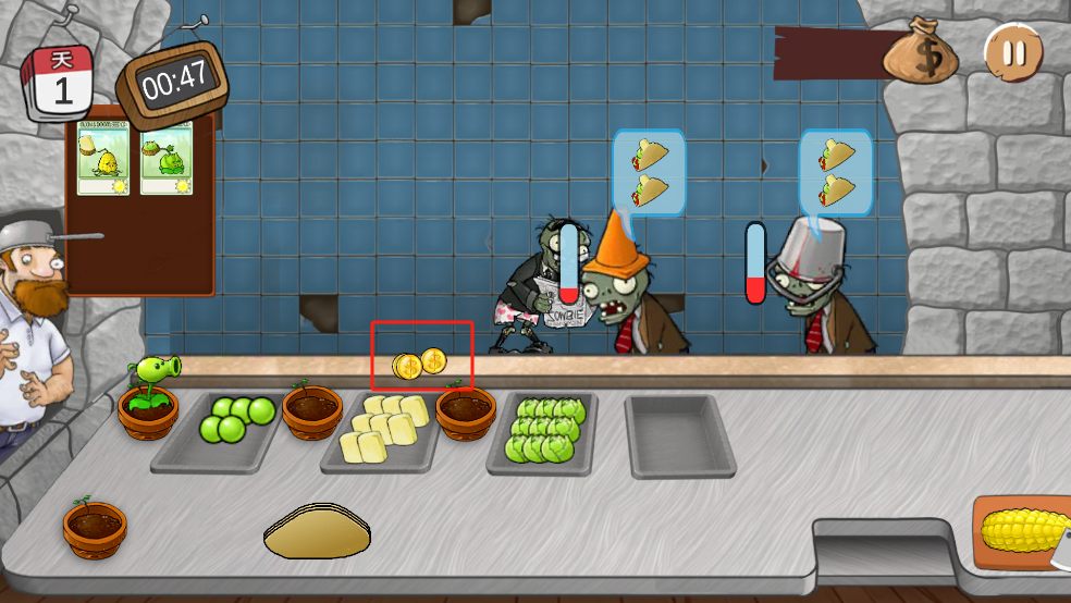 每一个僵尸都有一个耐心值,在耐心消耗完之前把沙威玛给僵尸就可以获得金币