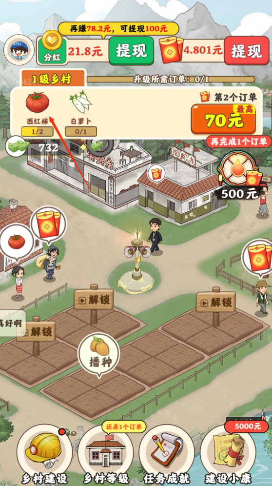 2、这款游戏非常有趣,只需轻松点击就能享受收菜的乐趣,并且每次完成订单还能领取红包奖励,简单又愉快