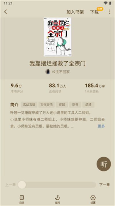 3、提供多种阅读模式,包括日间模式、夜间模式、护眼模式,确保用户在不同环境下都能获得舒适的阅读体验